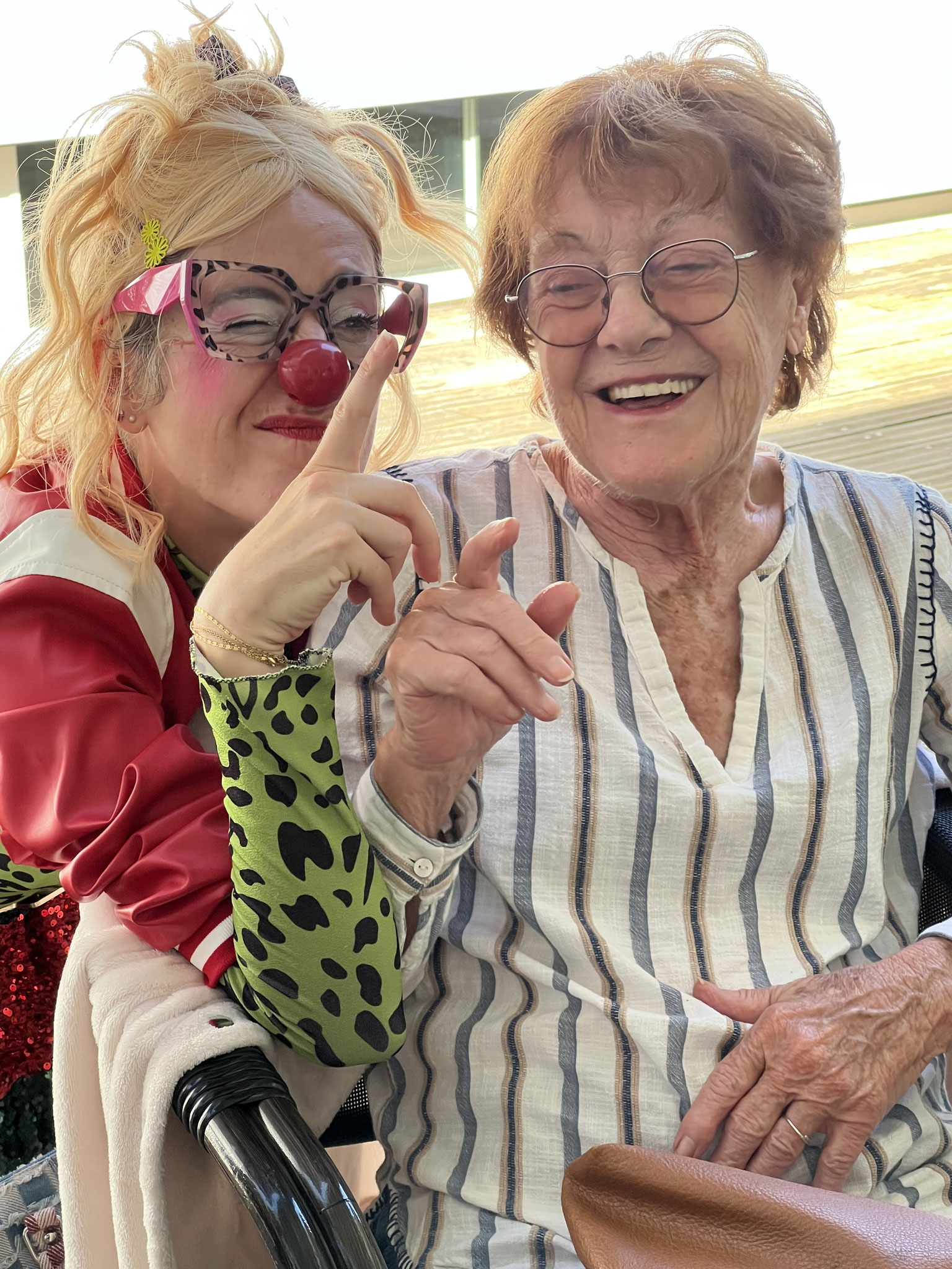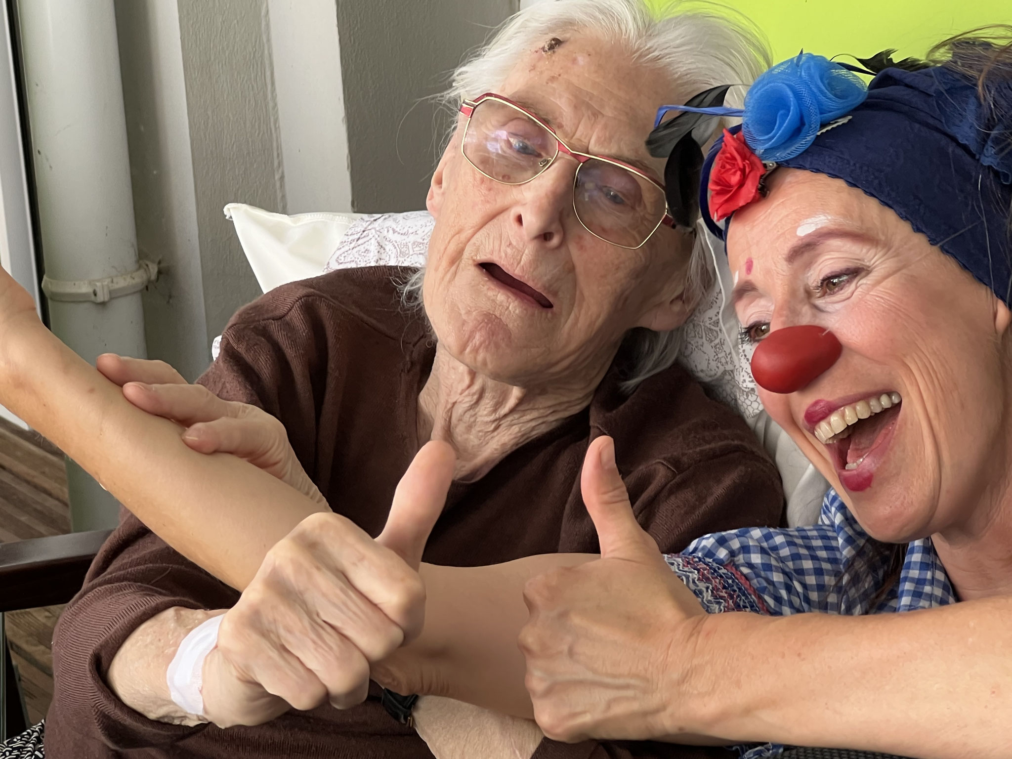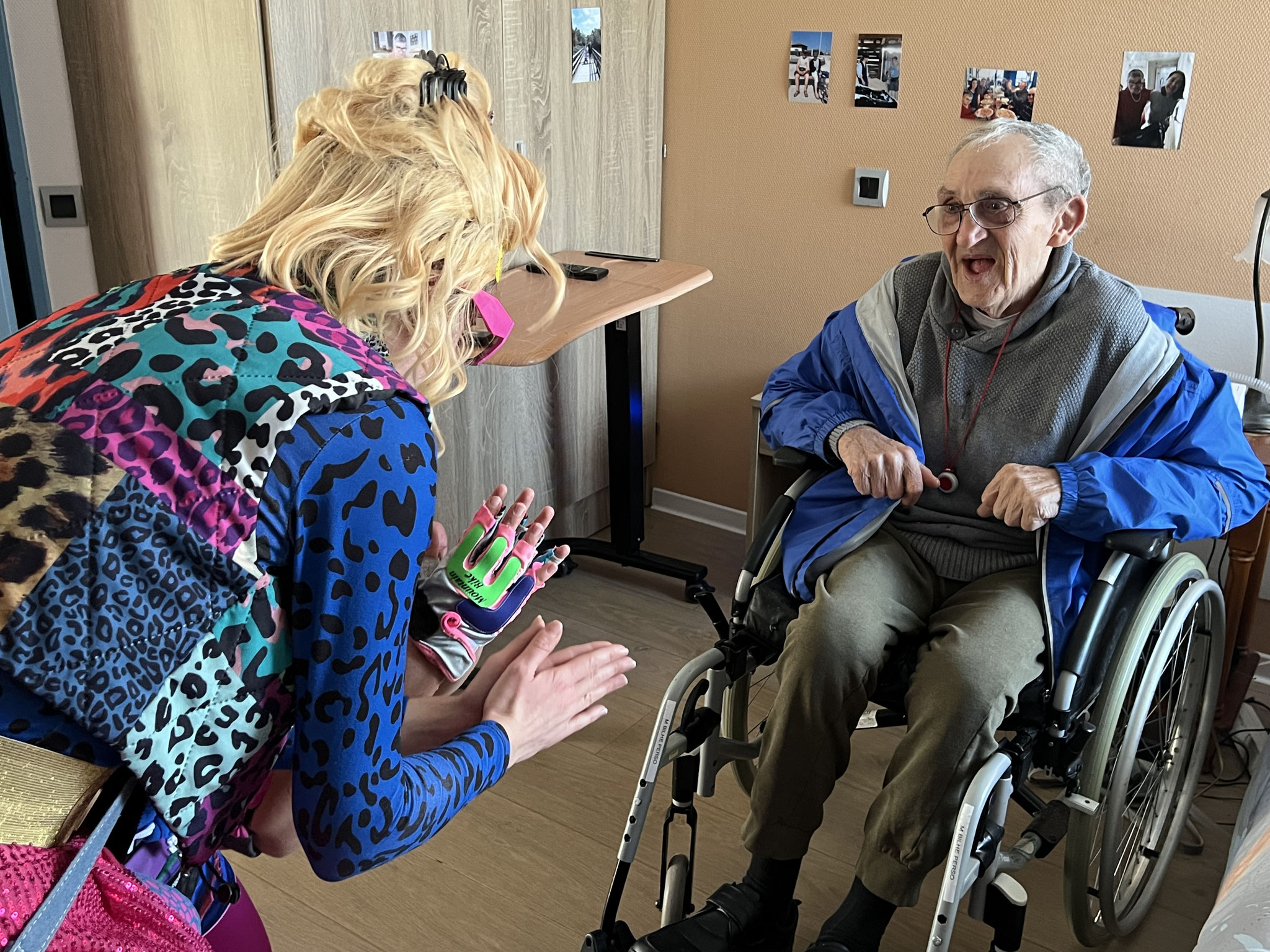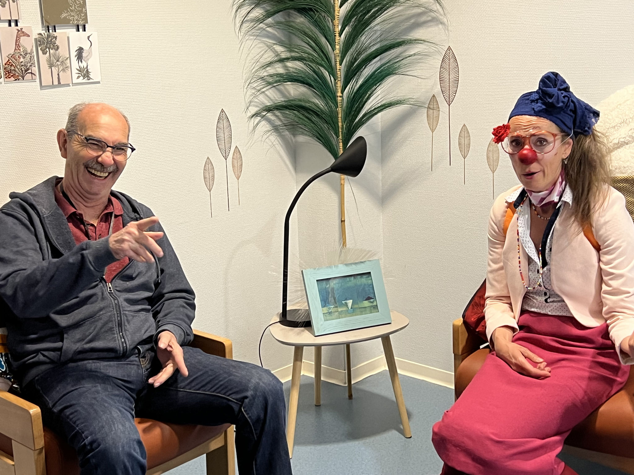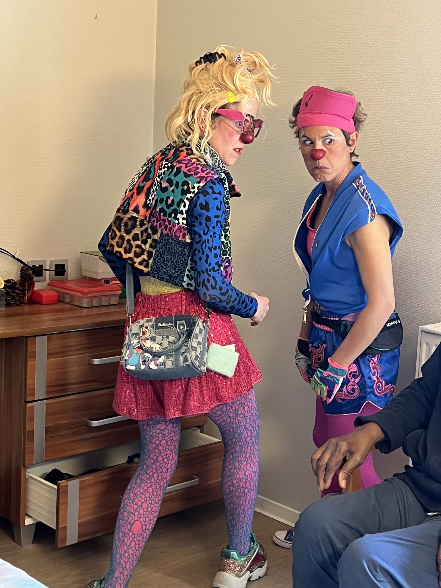 Le duo de clowns rencontre individuellement chaque personne dans son lieu de vie, sa chambre ou de manière plus exposée, en unité fermée ou "protégée".