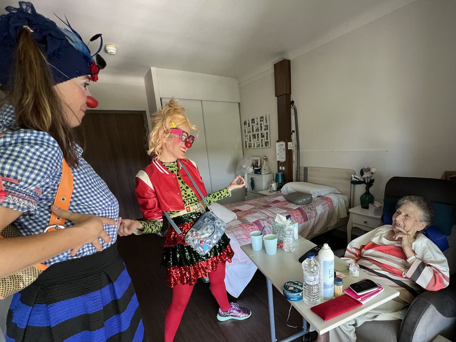 Le duo de clowns rencontre individuellement chaque personne dans son lieu de vie, sa chambre ou de manière plus exposée, en unité fermée ou "protégée".